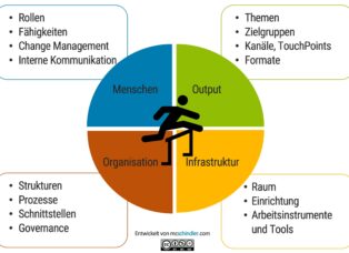 Sie beschäftigen sich mit dem Thema Newsroom? Aber Sie sehen den Wald vor lauter Bäumen nicht mehr? Hier gibt es Hilfe: Die 4 Handlungsfelder des Newsrooms sind Denkmodell und Werkzeug für alle, die sich in das Thema einarbeiten, einen eigenen Newsroom aufbauen oder ihren Newsroom auf den Prüfstand stellen. Die Handlungsfelder helfen, Gedanken und Ideen zu ordnen und Struktur ins Thema zu bringen. Sie orientieren sich an den vier Dimensionen Menschen, Output, Organisation und Infrastruktur.