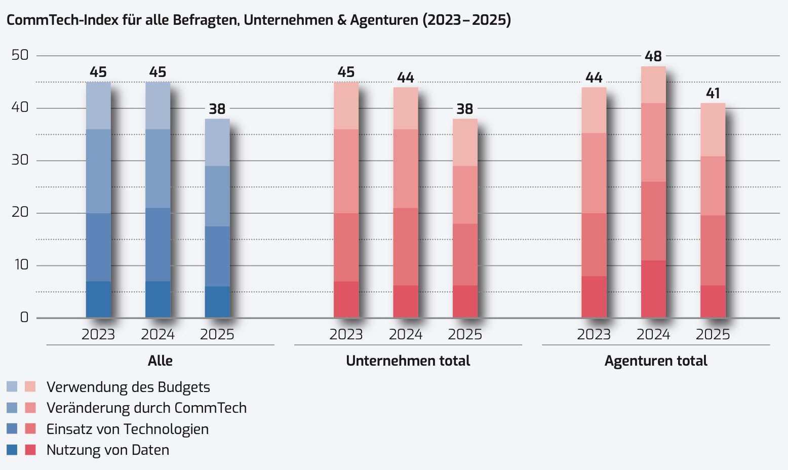 Der CommTech Index Report 2025/2026 erhebt den Digitalisierungsgrad von Kommunikationsabteilungen und PR-Agenturen im deutschsprachigen Raum. Der aktuelle Index liegt bei 38 von 100 Punkten und damit klar unter dem Vorjahreswert von 45. Dieser Rückgang bedeutet keinen Verlust an digitaler Reife, sondern zeigt den Red-Queen-Effekt: Die Technologie entwickelt sich schneller, als Kommunikationsabteilungen ihre Prozesse und Fähigkeiten nachführen können. Trotz hoher Offenheit für CommTech und KI bleibt die Branche zwischen Experimenten, Quick Wins und fehlender strategischer Verankerung gefangen. Gleichzeitig wächst die digitale Kluft zwischen grossen und kleinen Organisationen.