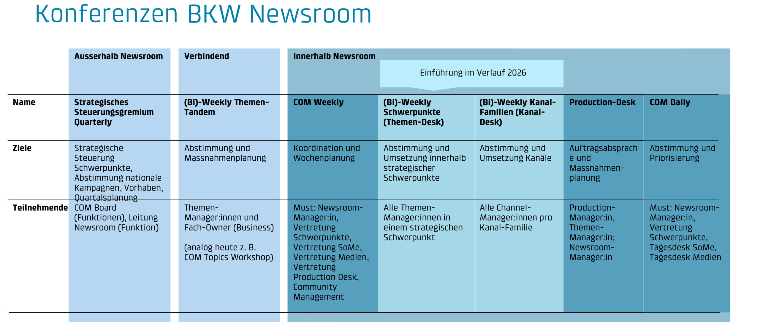Die Konferenzen im BKW Newsroom ergänzen sich vom strategischen Steuerungsgremium über das Weekly Themen-Tandem bis zum COM Weekly.